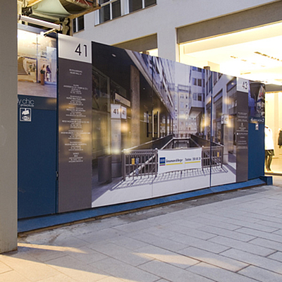 Bauzaun mal ganz anders – Geben Sie Ihrer Baustelle eine freundliche und interessante Wirkung. Egal ob Anwohner, Fußgänger oder Autofahrer. Der Bauzaun als visuelles Aha-Erlebnis einer meist nicht immer willkommenen Baustelle in der Nachbarschaft kann eine positive Brücke schlagen. Erfreuen Sie die Menschen mit interessanten Fotografie-Perspektiven, auffordernden Aktionen wie Gucklöchern oder augenzwinkernden Illustrationen. Verstehen Sie Ihren Zaun als Chance die Umgebung zu bereichern. So wird Ihr Projekt gekonnt präsentiert und stärkt ein homogenes Straßenbild.