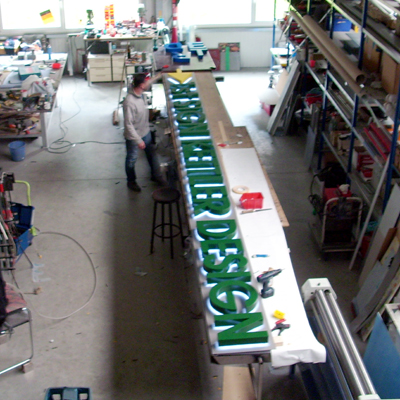 Herstellung aller Schilder in unserer Produktion - Wir be- und verarbeiten Aluminium, Edelstahl, Stahl, Kupfer, Messing und Kunststoffe. Dies beinhaltet Kant-, Schweiß-, Säge-, Schleif-, Polier- Lackierarbeiten, sowie Beschriftungsarbeiten mit Folie oder im Siebdruckverfahren.